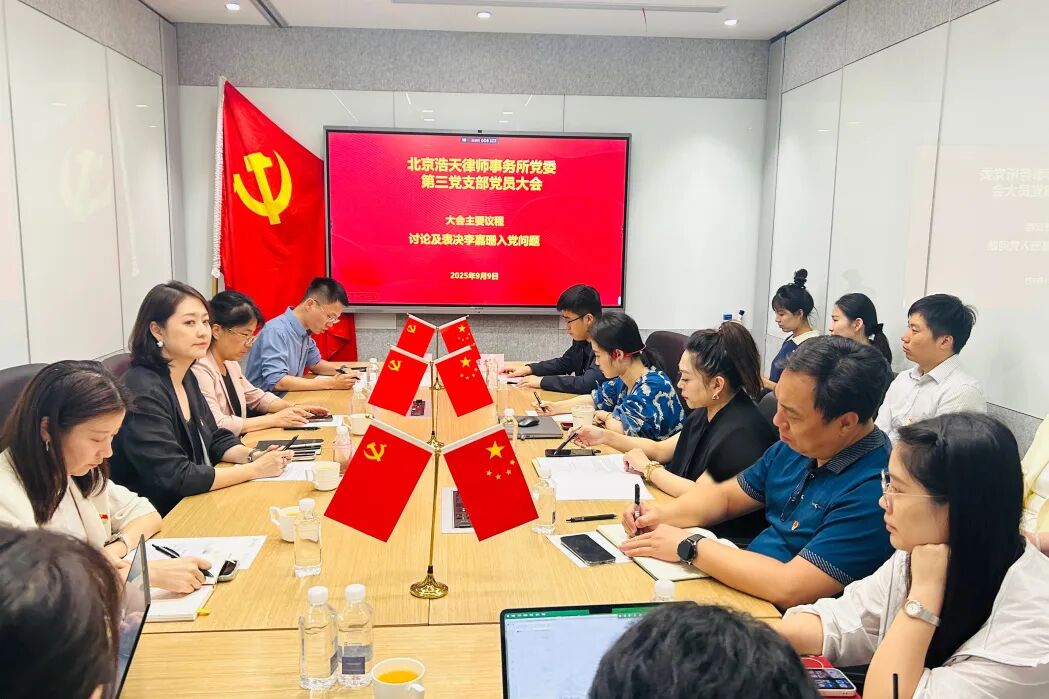 9月9日下午,中共浩天党委第三支部委员会召开党员大会,讨论表决预备党员发展事宜。会议由第三党支部书记裴洲剑同志主持,朝阳区律师行业党委委员、党委办公室主任、区律师协会秘书长刘素红同志出席了会议,浩天党委委员、管委会成员张淼同志以第三党支部党员身份参加了会议。会议在庄严的国歌中开始,会上,发展对象李嘉珊同志宣读了入党志愿书,介绍了自己的全面情况并向党组织做出郑重承诺。入党介绍人介绍了培养、考察意见。会议听取了与会同志的意见,进行了大会投票表决,一致同意接收李嘉珊同志为中共预备党员。会议要求,按照程序呈报浩天党委审核和朝阳区律师行业党委批准。