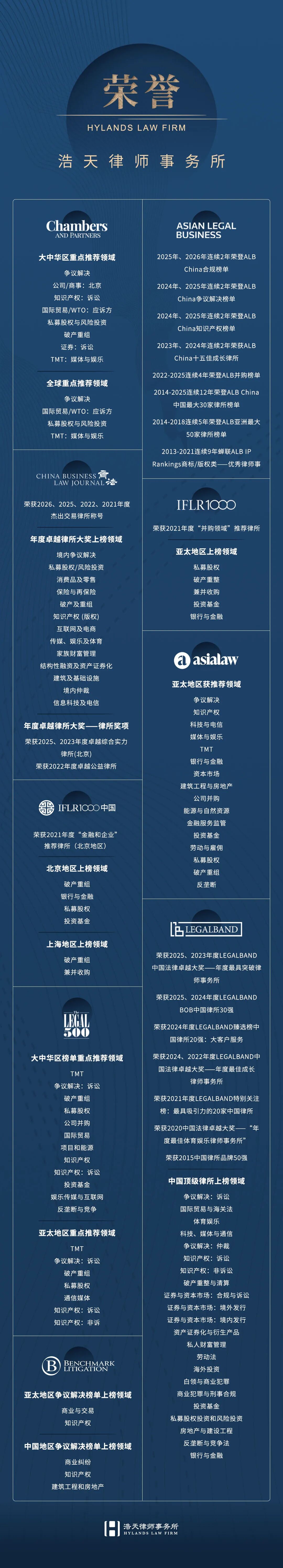 2026年3月11日,国际权威法律评级机构The Legal 500公布了“The Legal 500 2026中国城市精英”榜单,浩天北京办公室合伙人郝志国入选知产领域-北京地区排名;浩天重庆办公室合伙人杨洪胜入选公司和并购领域-重庆地区排名;浩天成都办公室合伙人刘欣、曾章波入选公司和并购领域-成都地区排名;浩天成都办公室合伙人蒋蜀新入选商事争议领域-成都地区排名。