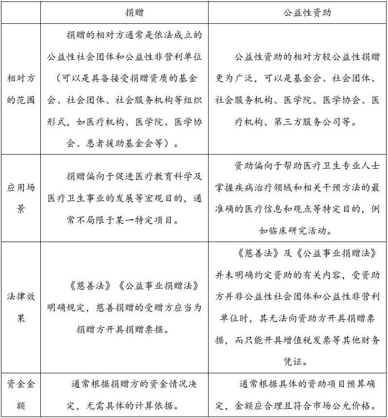 首先,《中华人民共和国慈善法》(以下简称"《慈善法》")及《中华人民共和国公益事业捐赠法》(以下简称"《公益事业捐赠法》")仅定义了“捐赠”行为,并未定义何为“资助”行为。《慈善法》及《公益事业捐赠法》虽然多次提及“资助”一词,但在法律规定场景下的“资助”倾向于慈善组织获得捐赠后再向其他慈善/公益组织或特定受益人无偿赠予,或政府提供资金支持等,即提供资助主体通常为慈善组织,而非医药企业。然而,不同于法律层面的规定,《医药企业防范商业贿赂风险合规指引》在规章制度层面将“资助”单独列项,其主要原因是“资助”的相对方、目的、法律效果及合规要点与“捐赠”存在不同,具体如下: